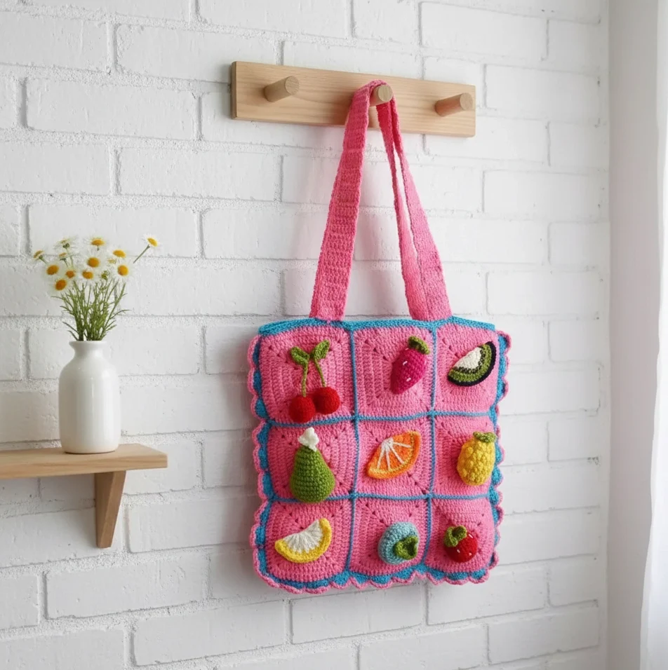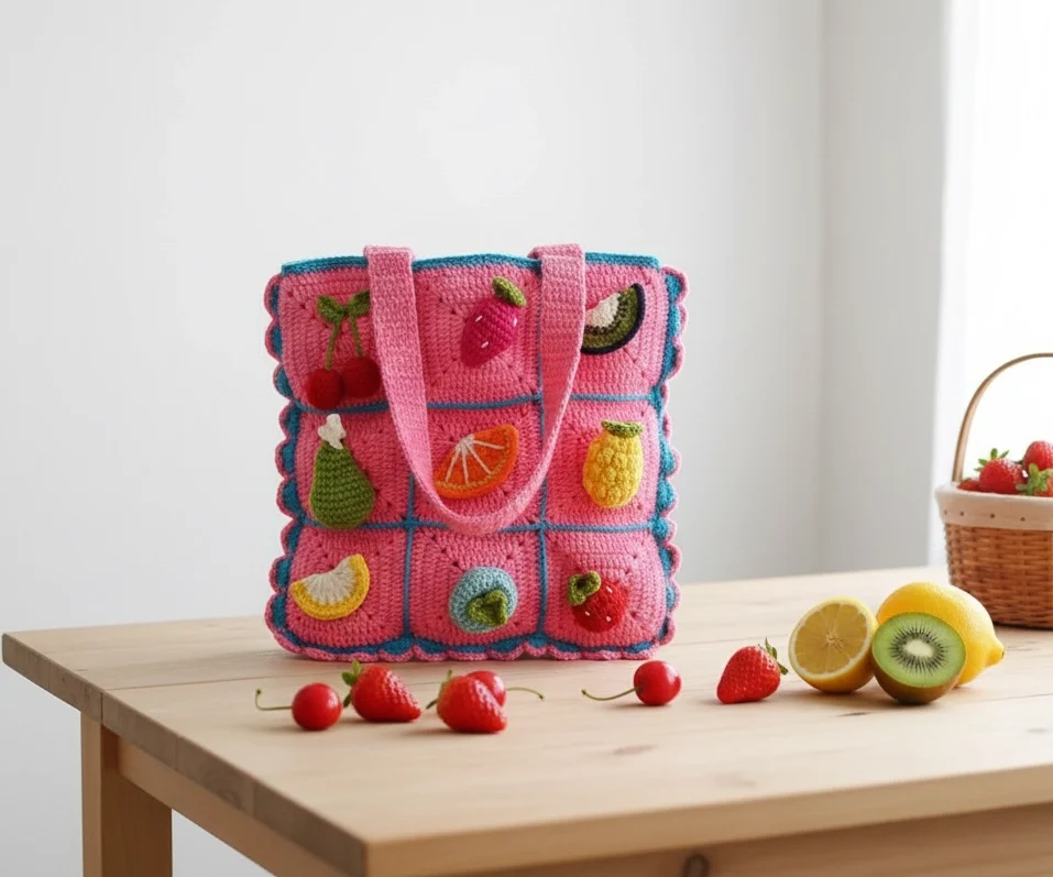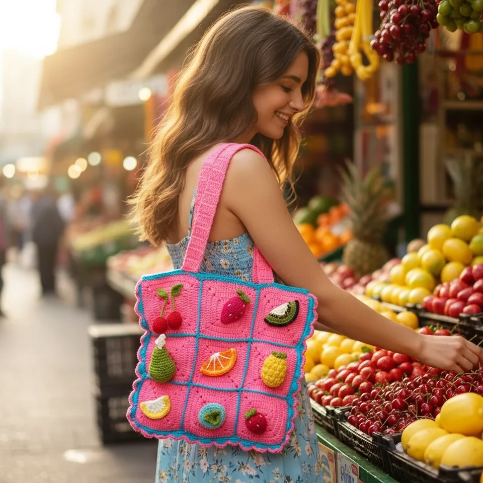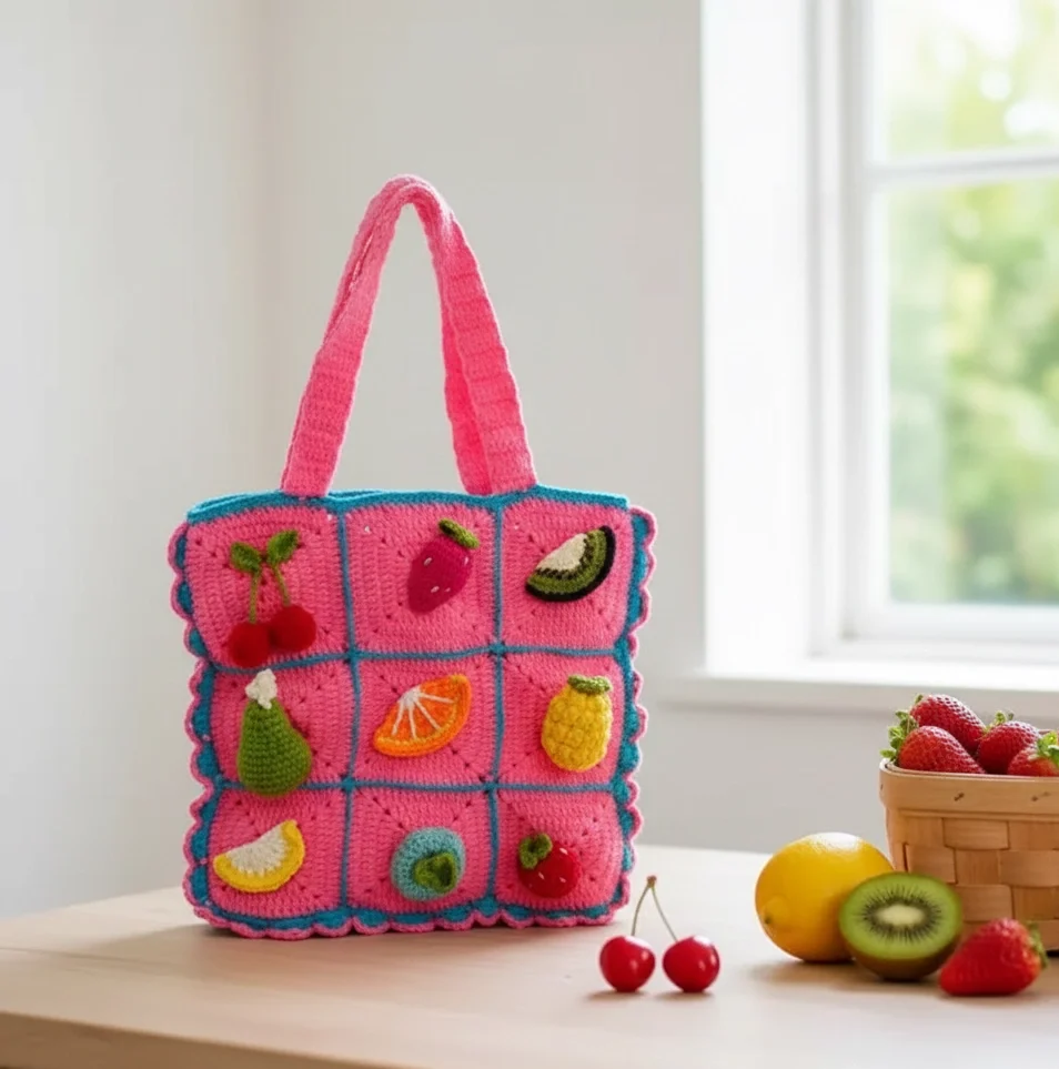 Experience the Charm of Slow Fashion Each “Tutti Frutti” bag is a labor of love, taking hours of meticulous hand-stitching to complete. Unlike mass-produced accessories, this bag features elevated 3D fruit motifs—including juicy strawberries and zesty lemons—that are crocheted separately and securely hand-fastened to the squares for a beautiful, tactile finish.