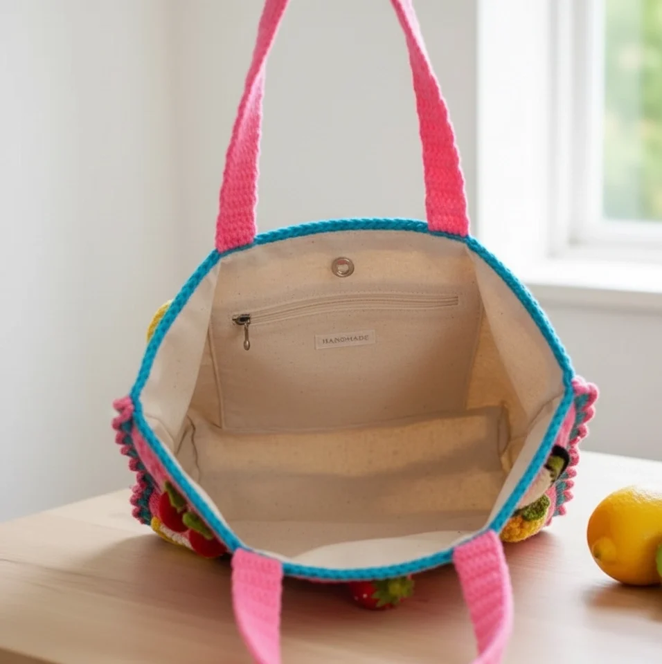 I was hesitant about the price at first, but seeing the 3D strawberries and lemons in person changed everything. The craftsmanship is incredible. It’s fully lined (which is a lifesaver for crochet bags), and the yarn feels so premium. It took about 4 weeks to arrive, but for a handmade piece of this quality, it was 100% worth the wait!
