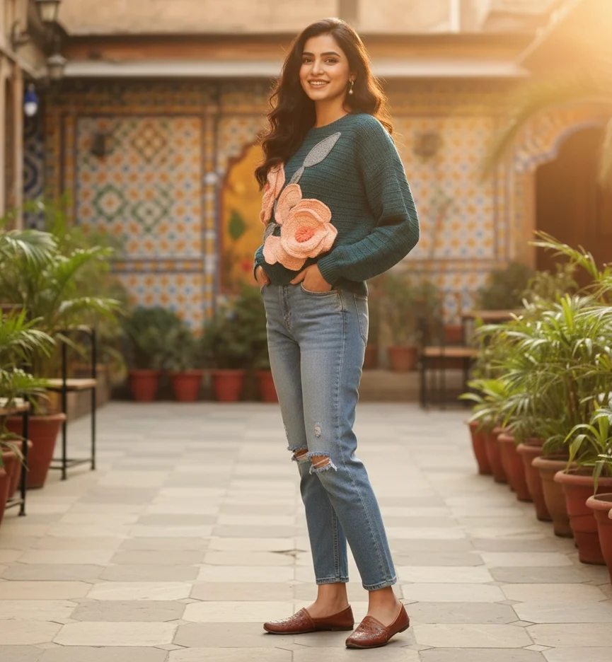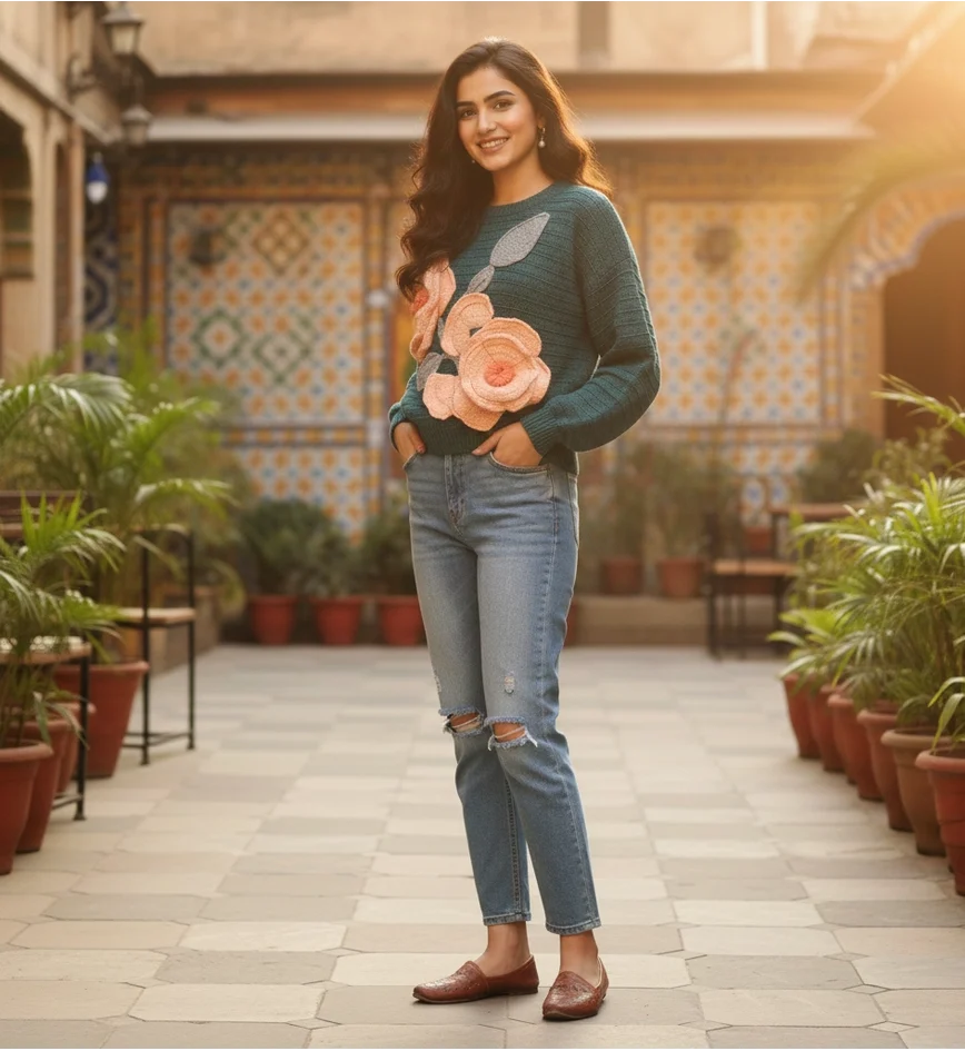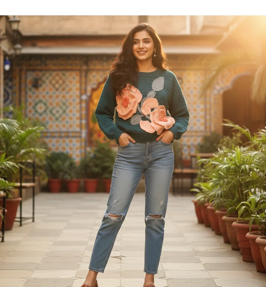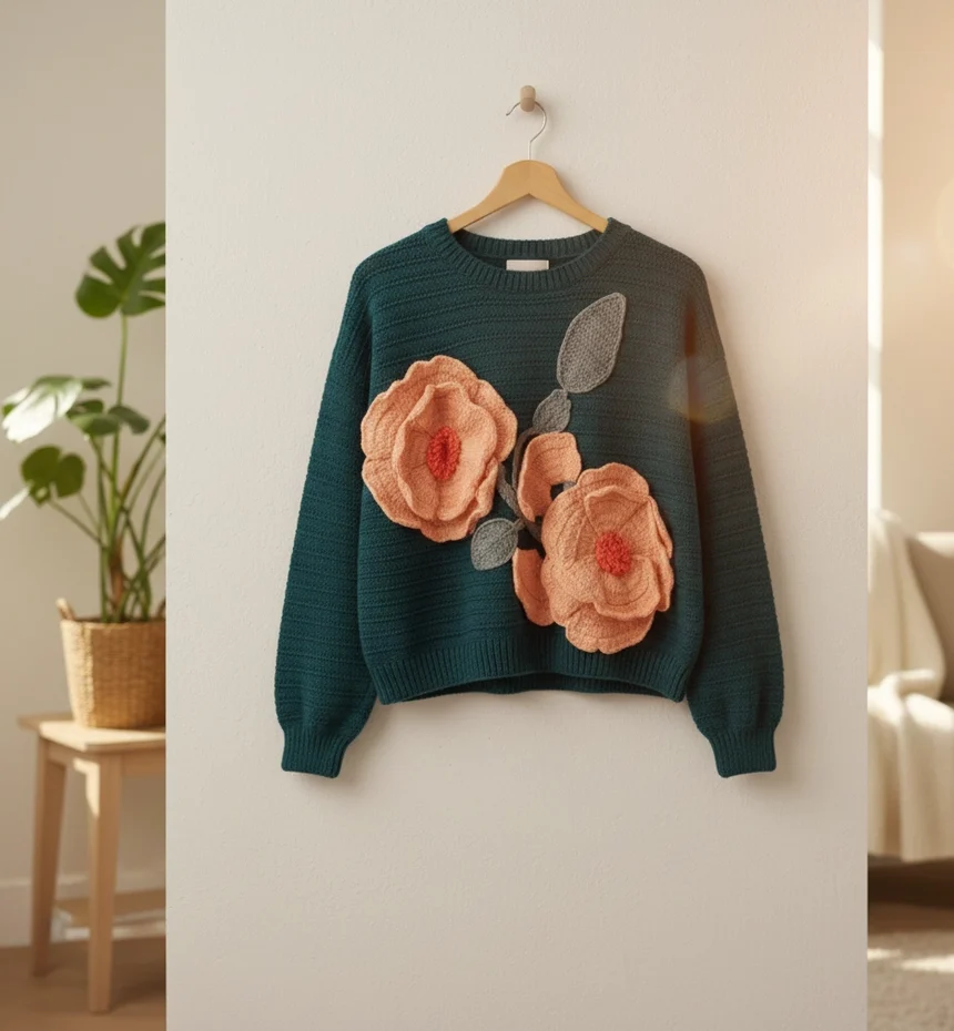 Bloom in every season. This handcrafted teal green pullover features intricately detailed 3D floral appliqués that bring a garden-fresh feel to your winter wardrobe. Made from premium soft-touch yarn, it’s a wearable work of art designed for those who value slow fashion and unique, tactile textures.