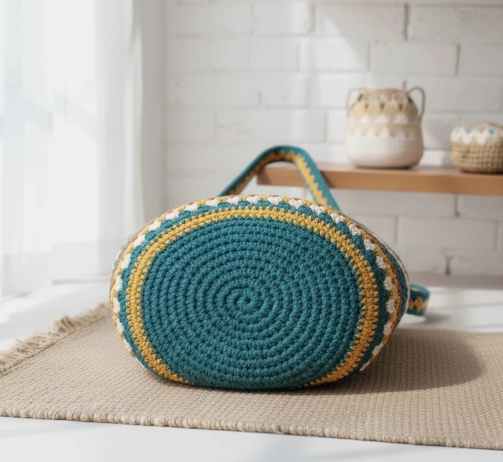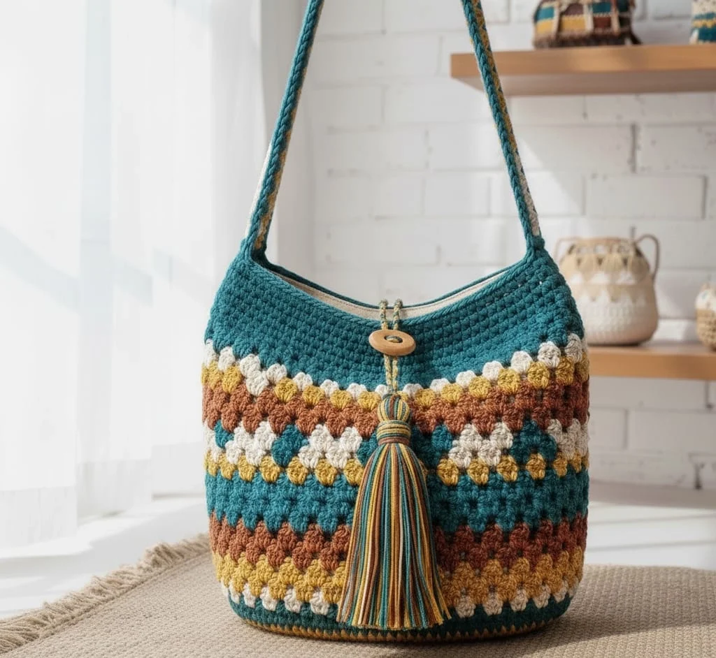 Step out in style with this stunning, 100% handcrafted crochet hobo bag. It features a vibrant, sun-drenched striped pattern in rich teal, mustard yellow, and terracotta, creating a beautiful vintage-bohemian look.
