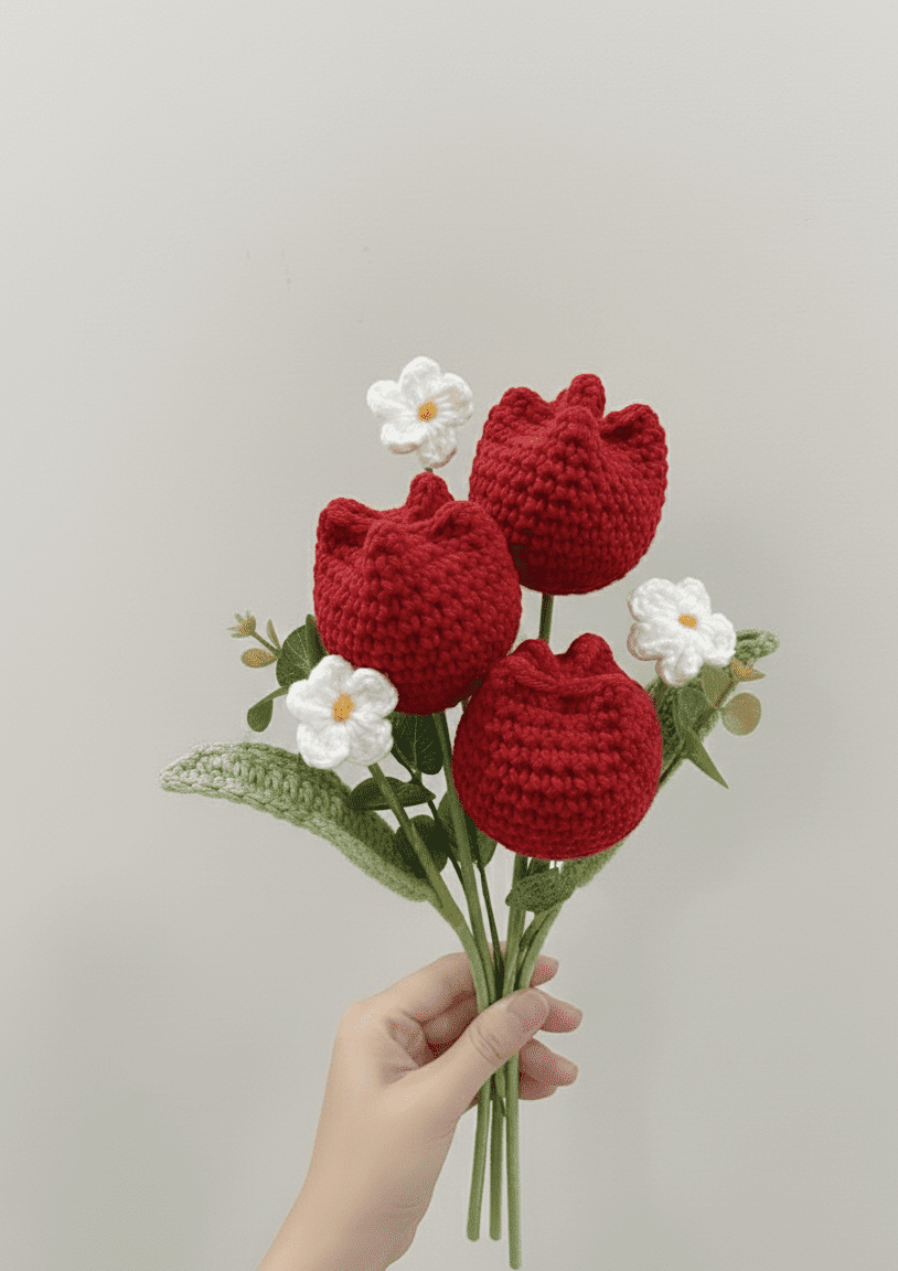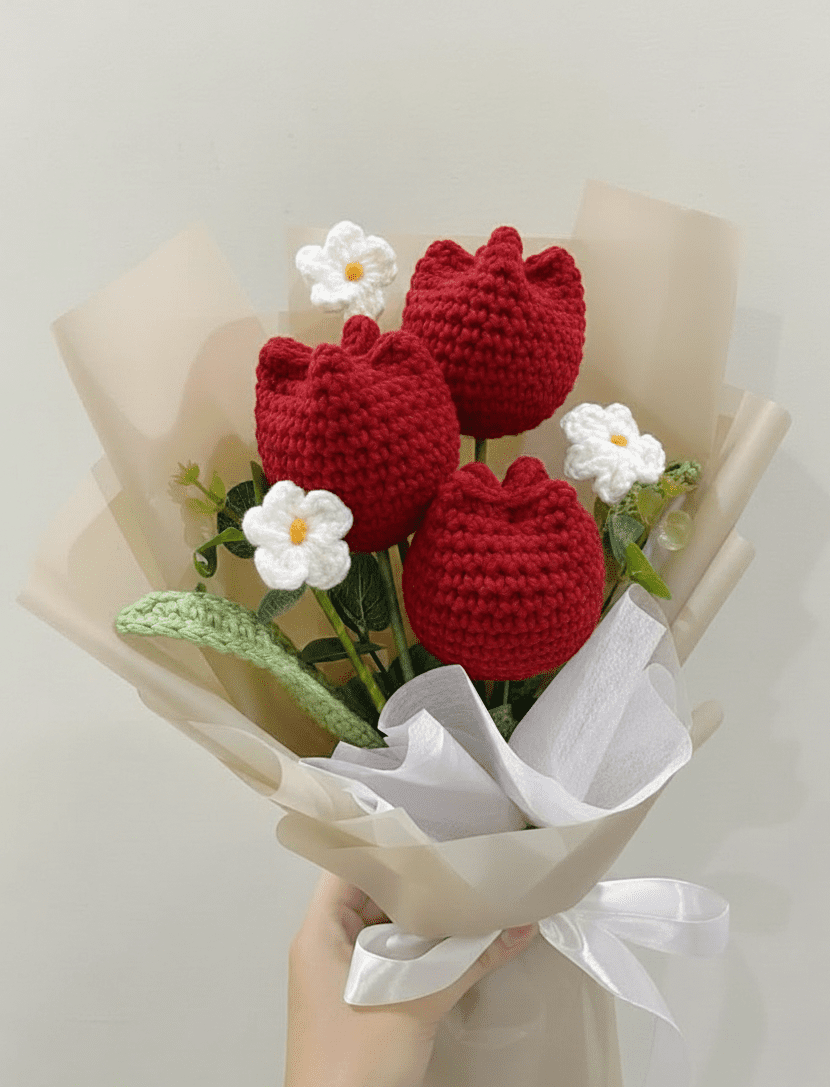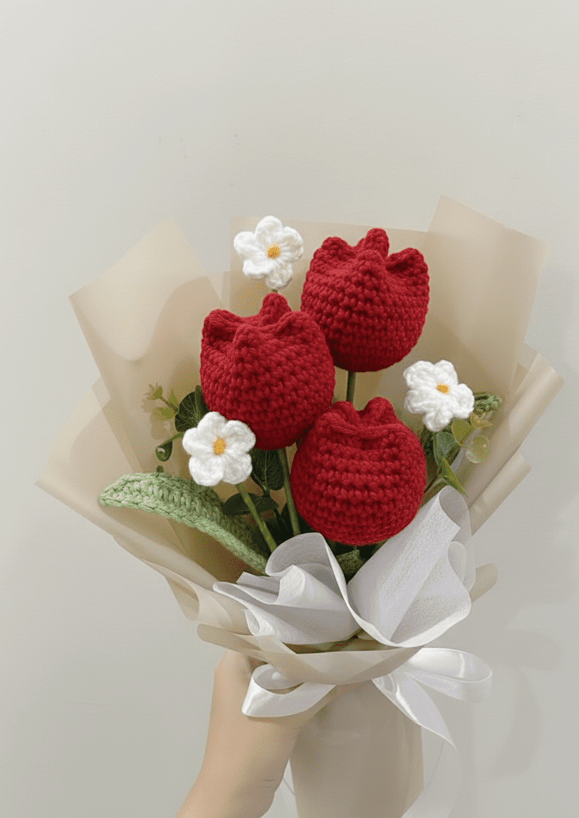 The Everlasting Bloom bouquet features a collection of 10–12 meticulously crocheted tulips. Each flower is individually crafted using high-quality milk cotton yarn, giving them a soft, matte finish and a realistic “plump” texture.