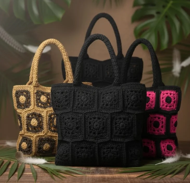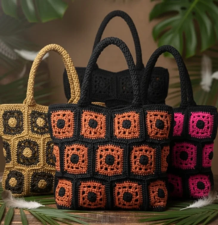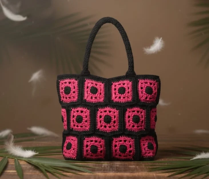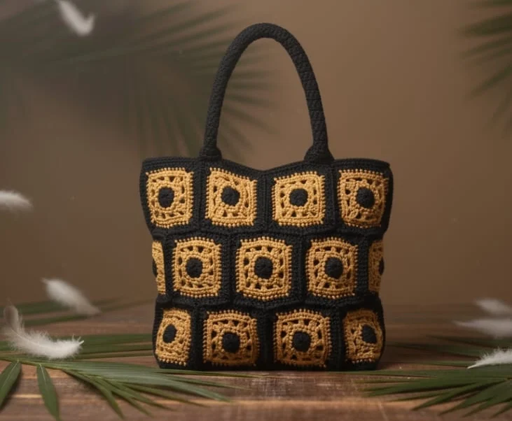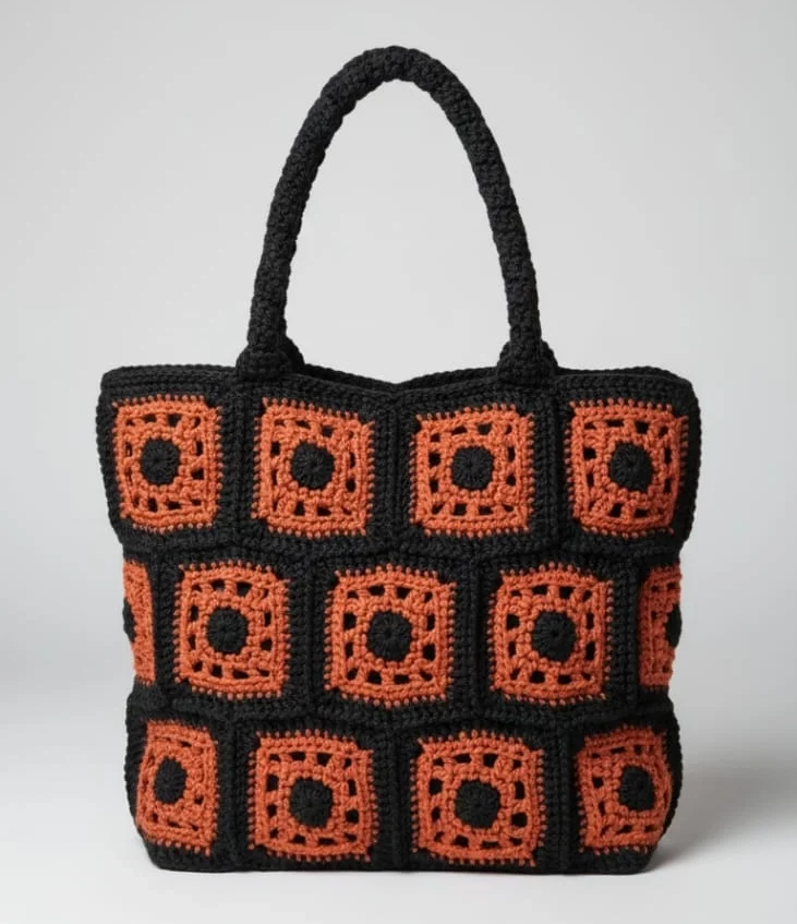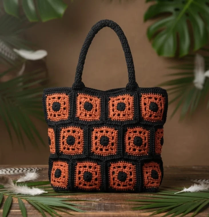The Faifat Midnight Sunset Tote is a bold, structured handbag featuring a striking 3×3 grid of hand-crocheted granny squares in contrasting Black and vibrant Burnt Orange. Defined by its geometric design and sturdy, hand-crocheted black handles, this tote is a confident and stylish carryall for everyday use.