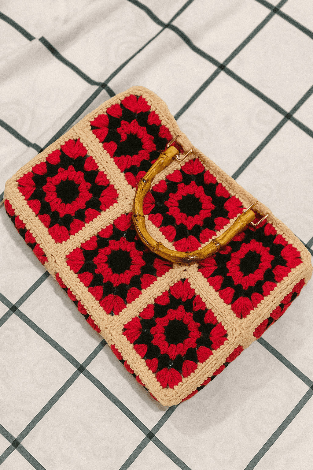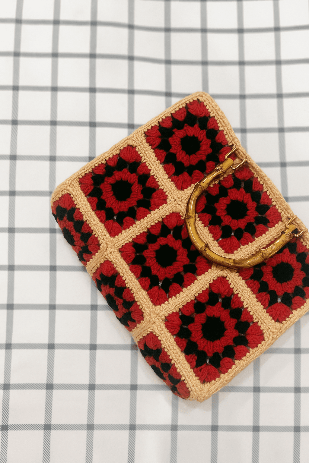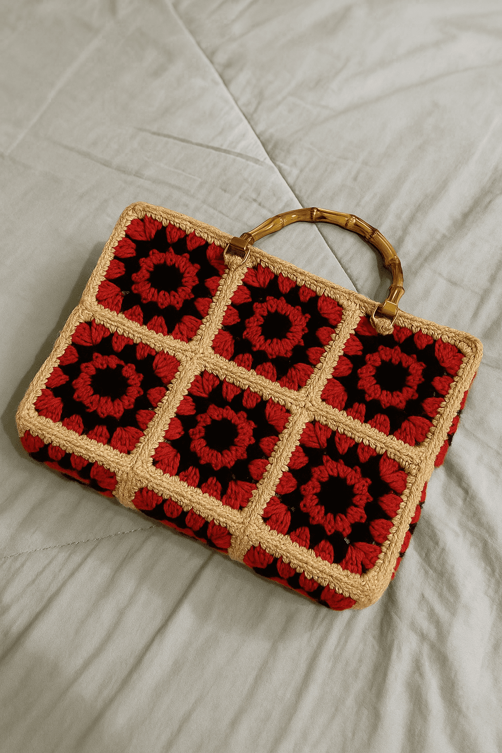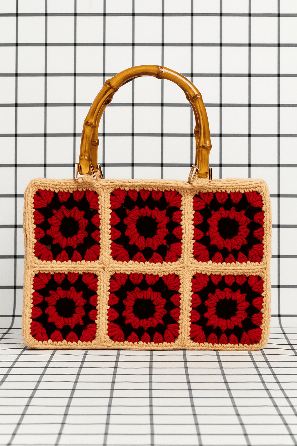 The Faifat Rouge Bamboo Satchel by Faifat Official is a head-turning accessory that blends classic crochet with sophisticated hardware. The structured body is assembled from six meticulous granny squares (in a 2×3 grid), each featuring a captivating, dark floral-like motif in bold Rouge (Red) set against a dramatic Black background. A neutral, sturdy border provides a clean, elegant frame for the squares, enhancing the vintage appeal.