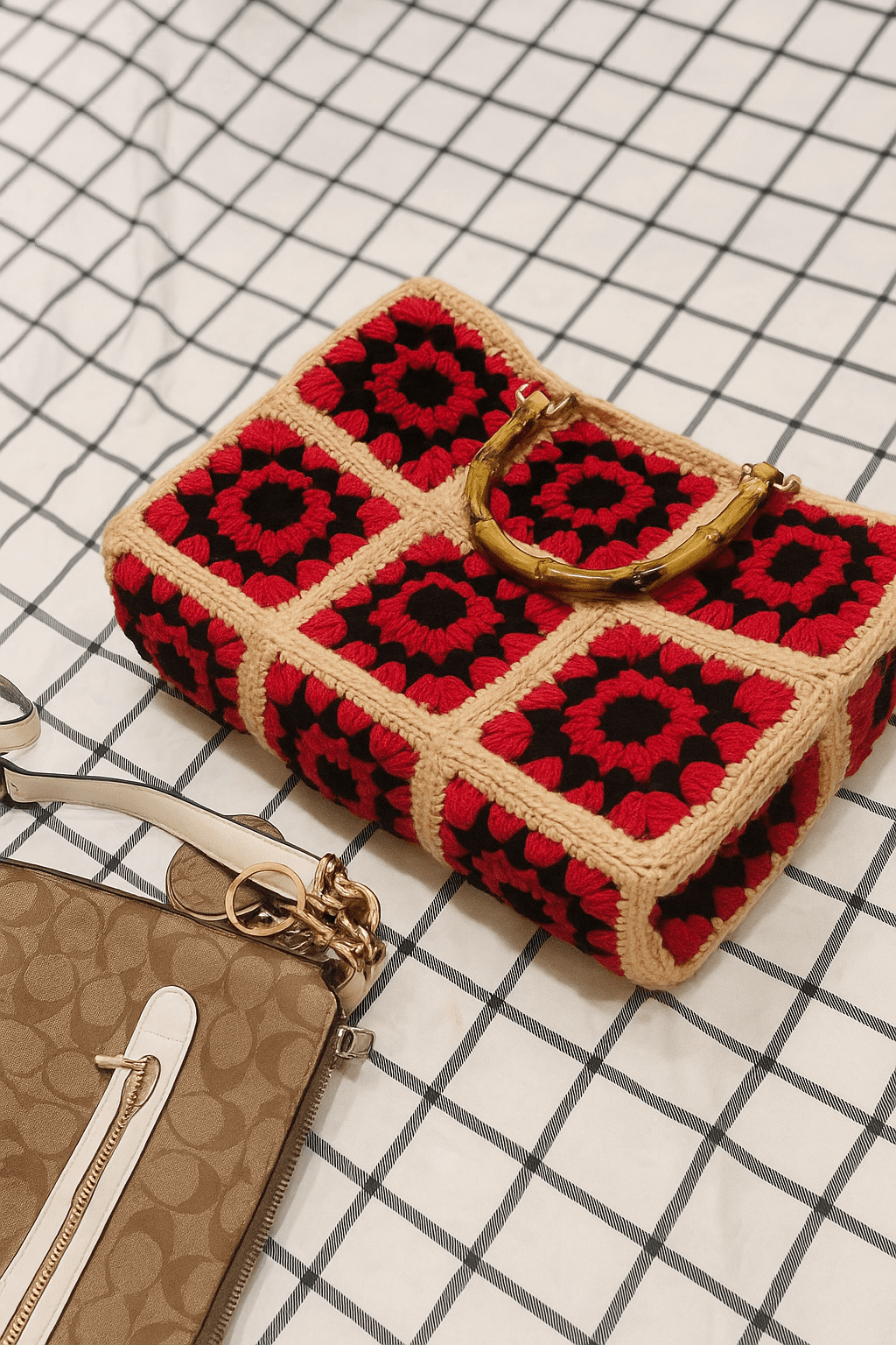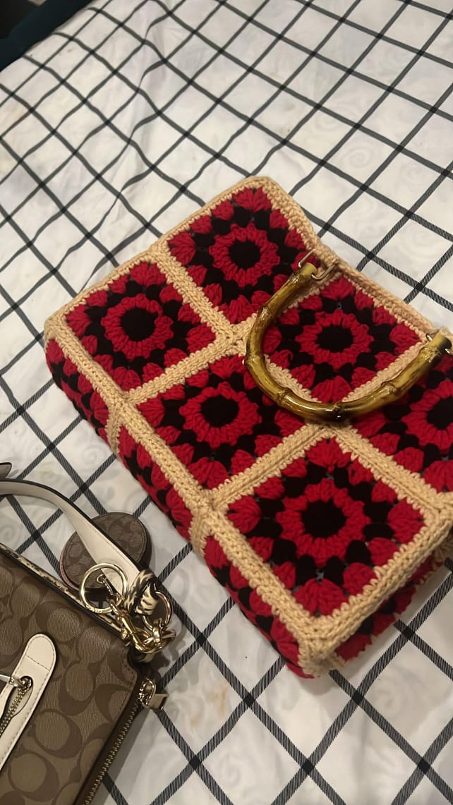 The Faifat Rouge Bamboo Satchel is a luxurious, structured handbag featuring a dynamic patchwork of hand-crocheted granny squares in a bold Black and Rouge (Red) motif.