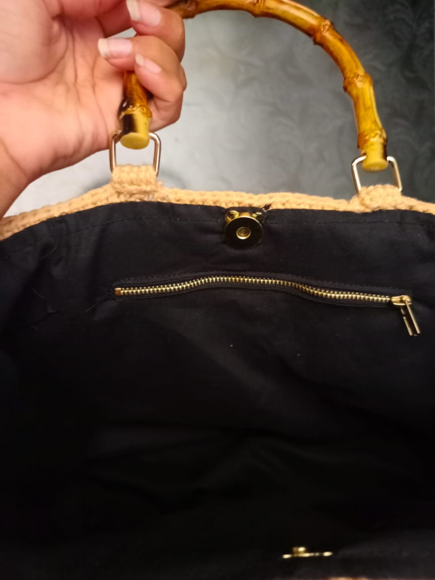 The satchel is defined by its smooth, curved, natural bamboo top handle, which offers a unique contrast to the plush crochet body. The interior is fully lined with high-grade fabric, providing a clean, protected compartment for your essentials. Its boxy, structured shape ensures stability, making it both a beautiful and practical choice. This bag is a high-quality, artisanal accessory that evokes a sense of retro glamour and exotic elegance.