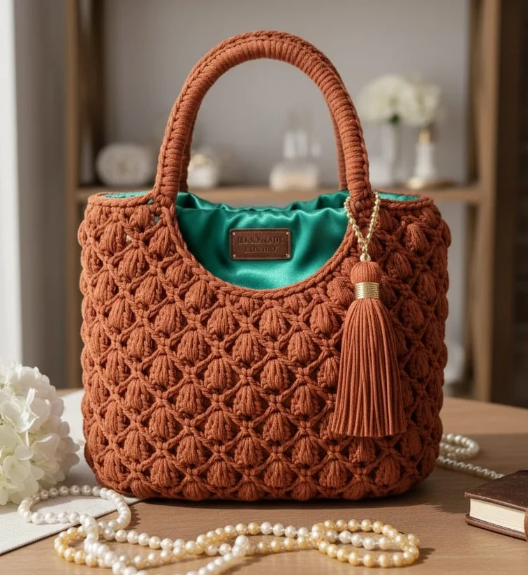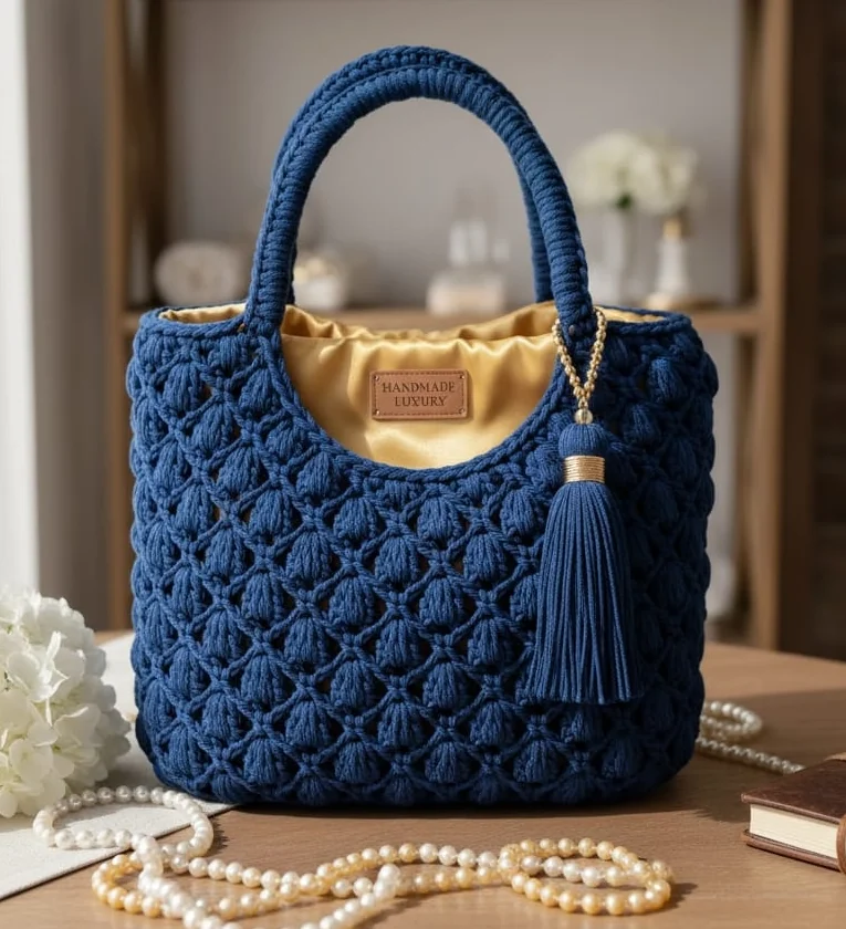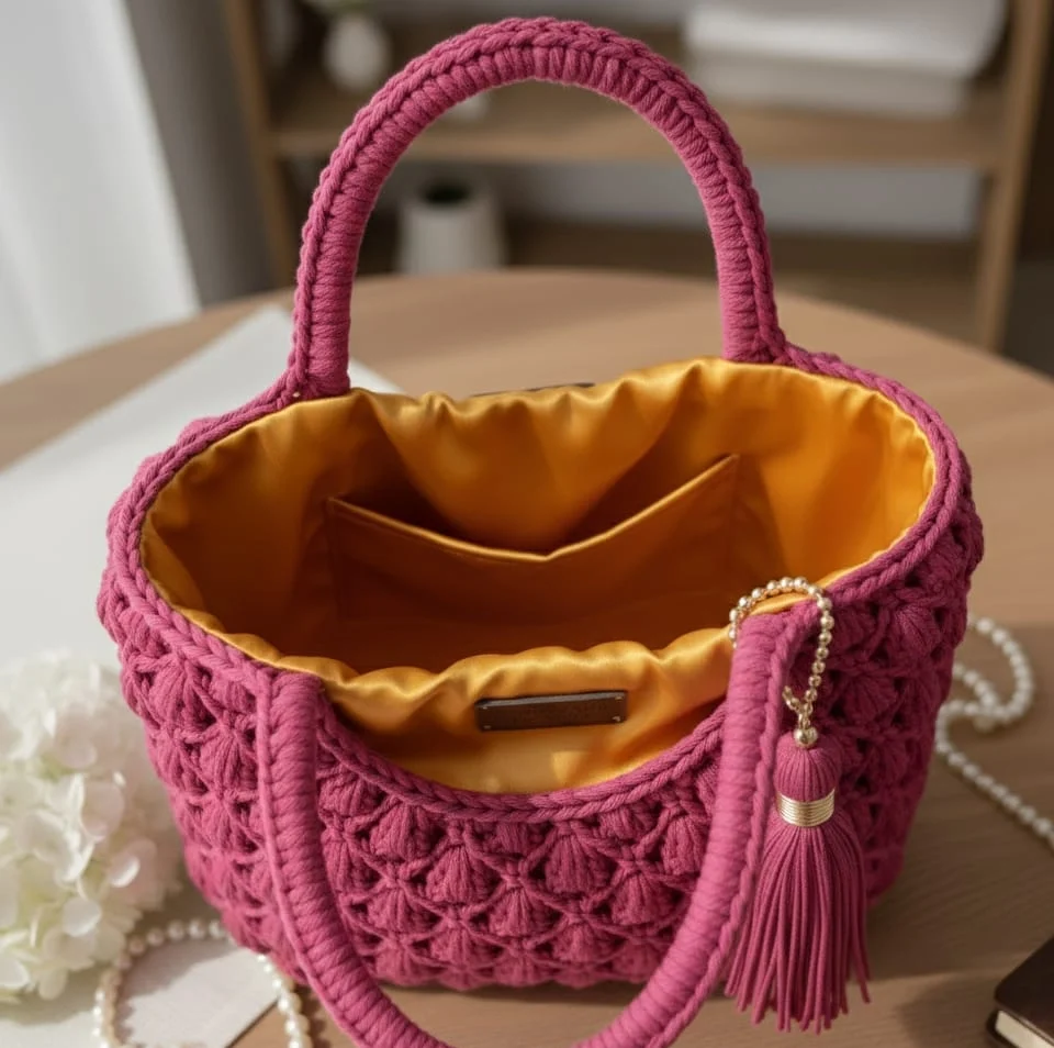 Elegant Crocheted Handle: Finished with a sturdy, meticulously crocheted top handle that ensures comfortable carry while maintaining a sophisticated silhouette.