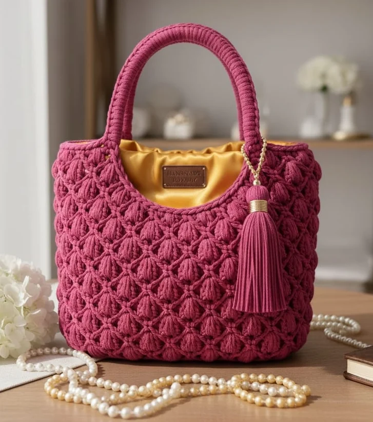 This piece fuses playful texture with luxurious detail, boasting a stunning golden satin interior lining for an opulent contrast. Finished with an elegant crocheted top handle and matching tassel, it’s the perfect accessory to add a bold pop of sophisticated, handmade color to any ensemble.