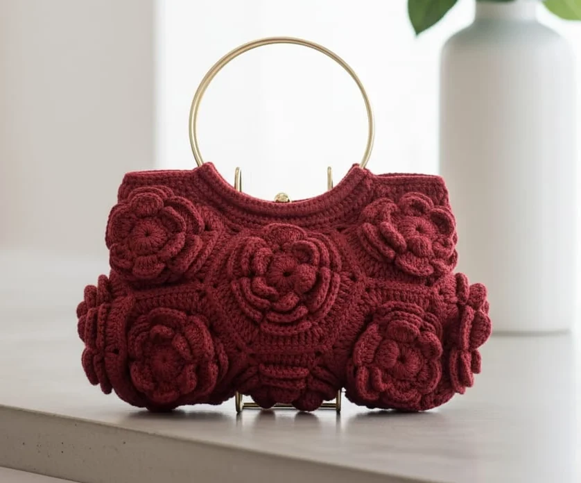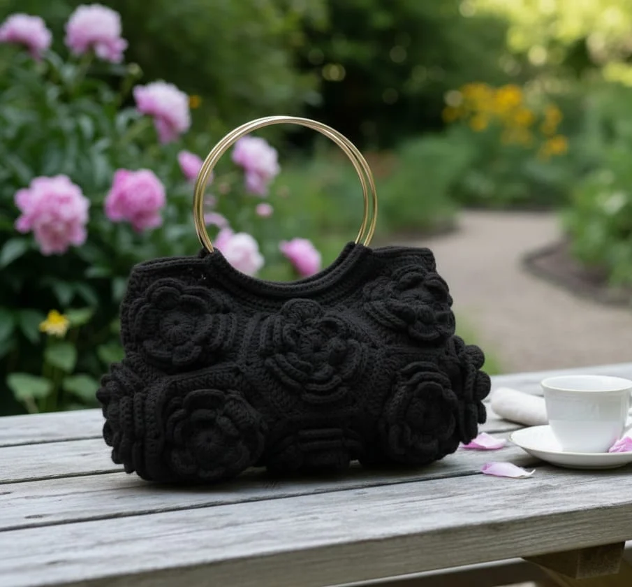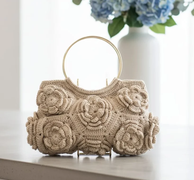 The bag’s body is meticulously constructed from a dense, natural-toned yarn, serving as a canvas for the numerous 3D floral motifs (appearing like layered crochet roses or gardenias). These substantial appliqués are stitched by hand onto the bag’s surface, creating a beautiful, all-over textured pattern that is both visually stunning and substantial to the touch.