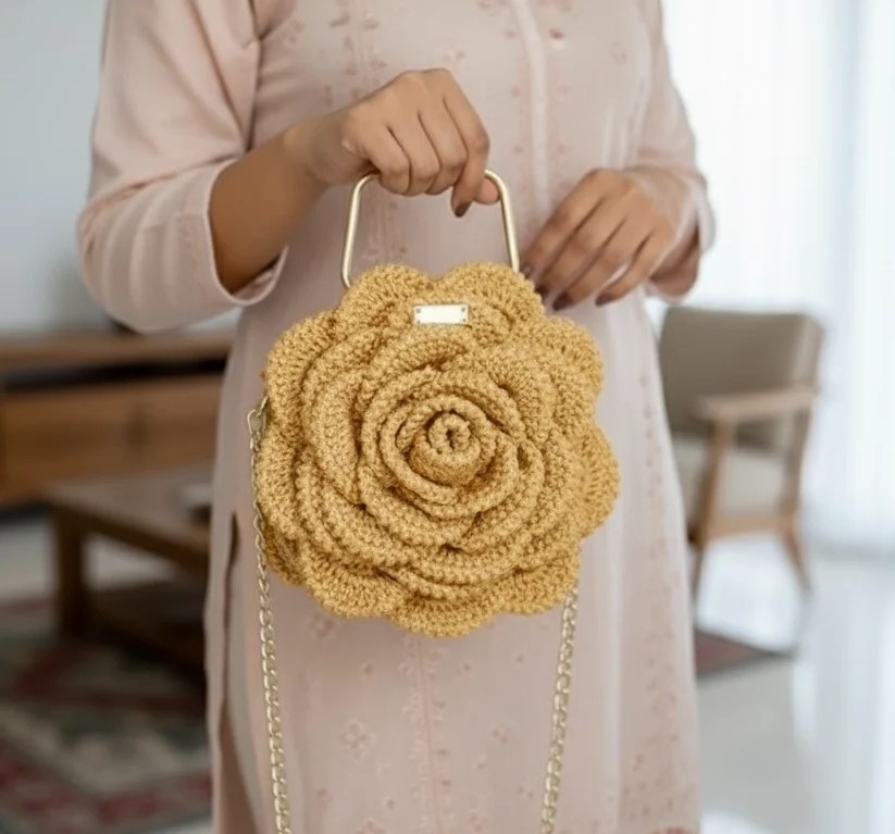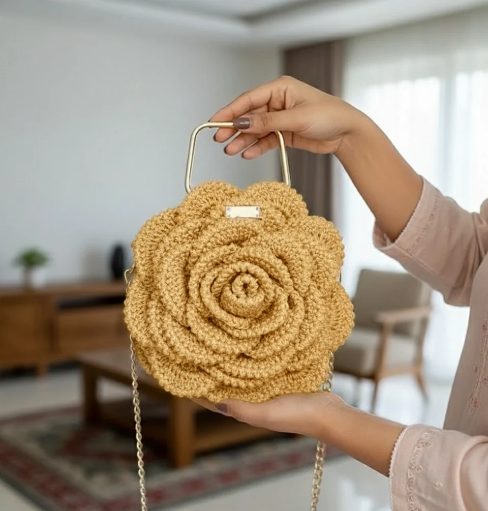 The Golden Rosette Satchel is a magnificent, highly sculptural handbag featuring a continuous 3D blooming rose design. Crafted with firm, high-quality yarn in a rich golden hue and finished with a structured metallic top handle and a delicate chain strap, this satchel is the ultimate statement piece for evening events or chic daytime wear.