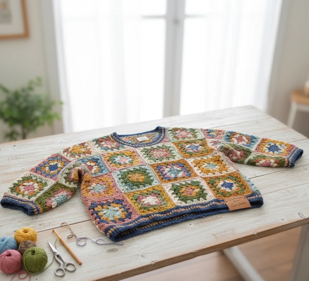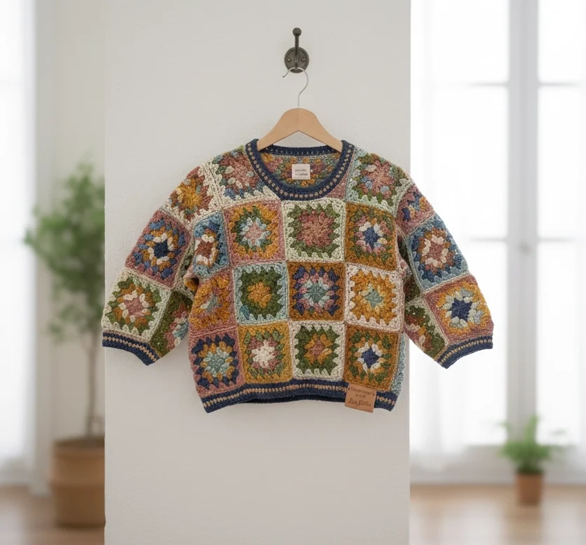 The Meadow Bloom Pullover is a cozy, handcrafted statement piece that brings the nostalgia of vintage crochet into the modern wardrobe. Expertly assembled from individual, multi-hued granny squares, this pullover is more than a garment—it is a collector’s item.