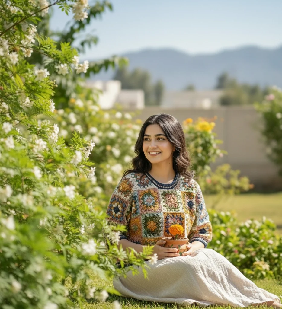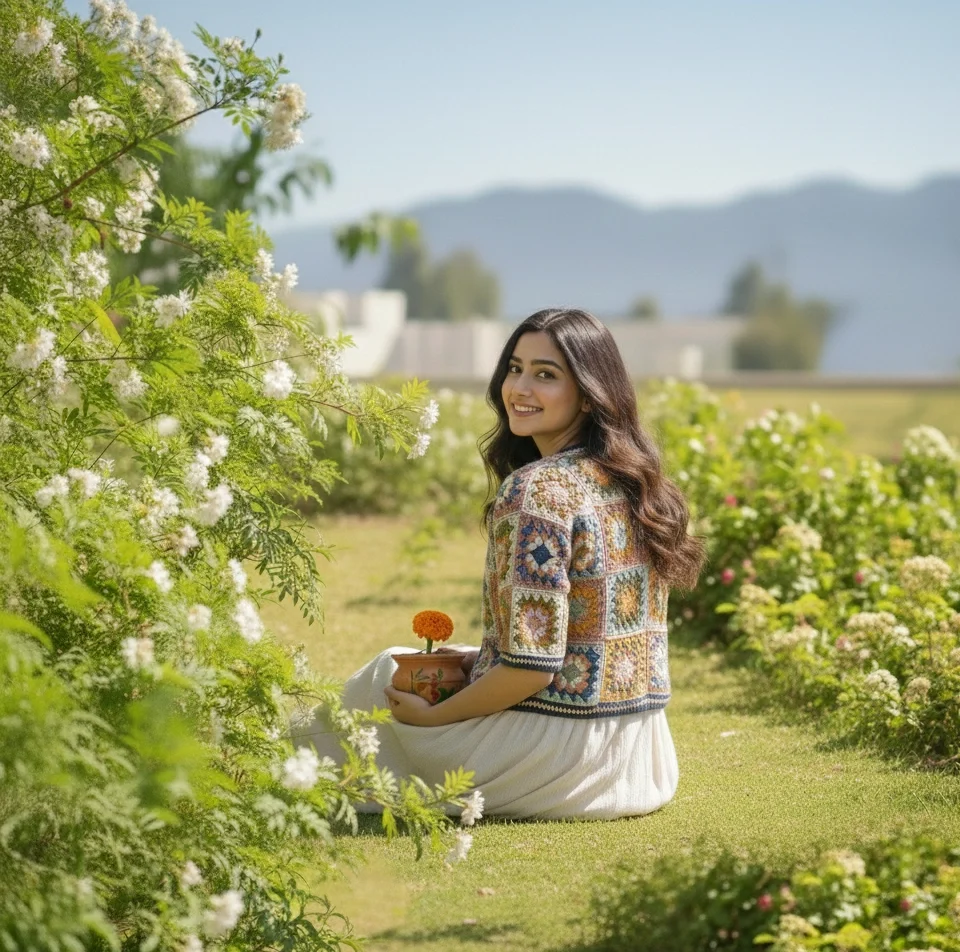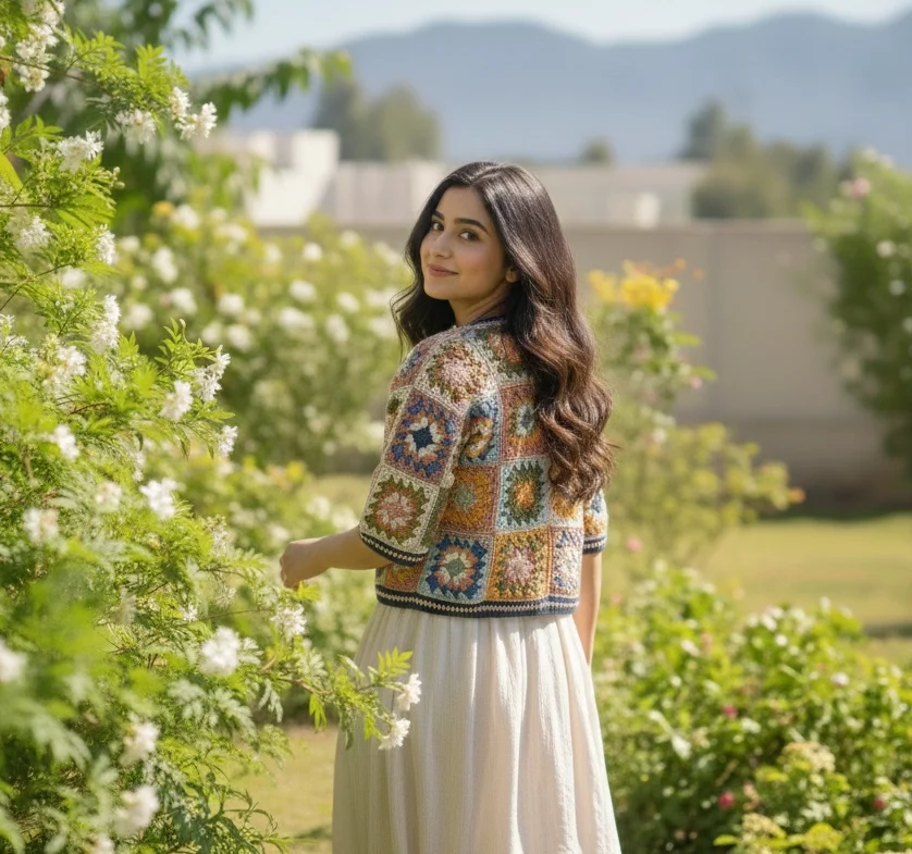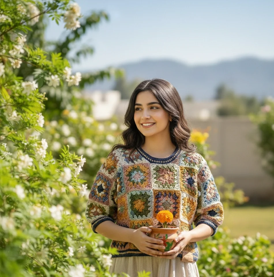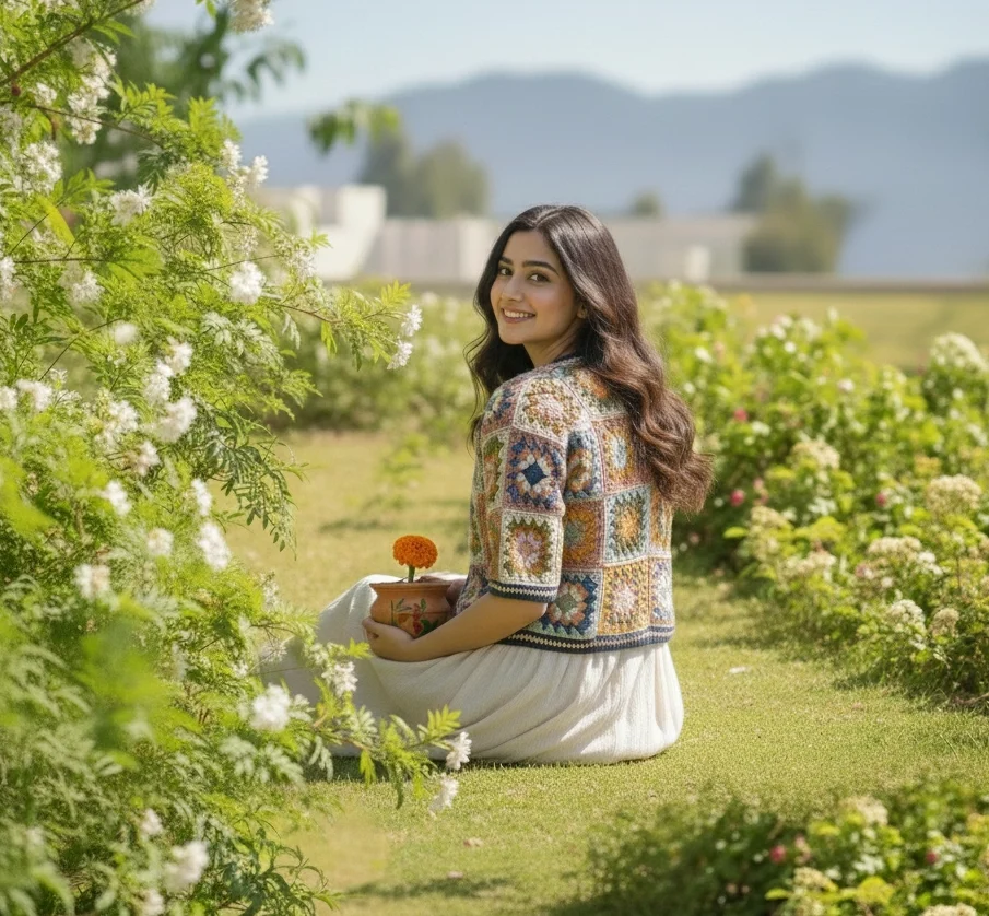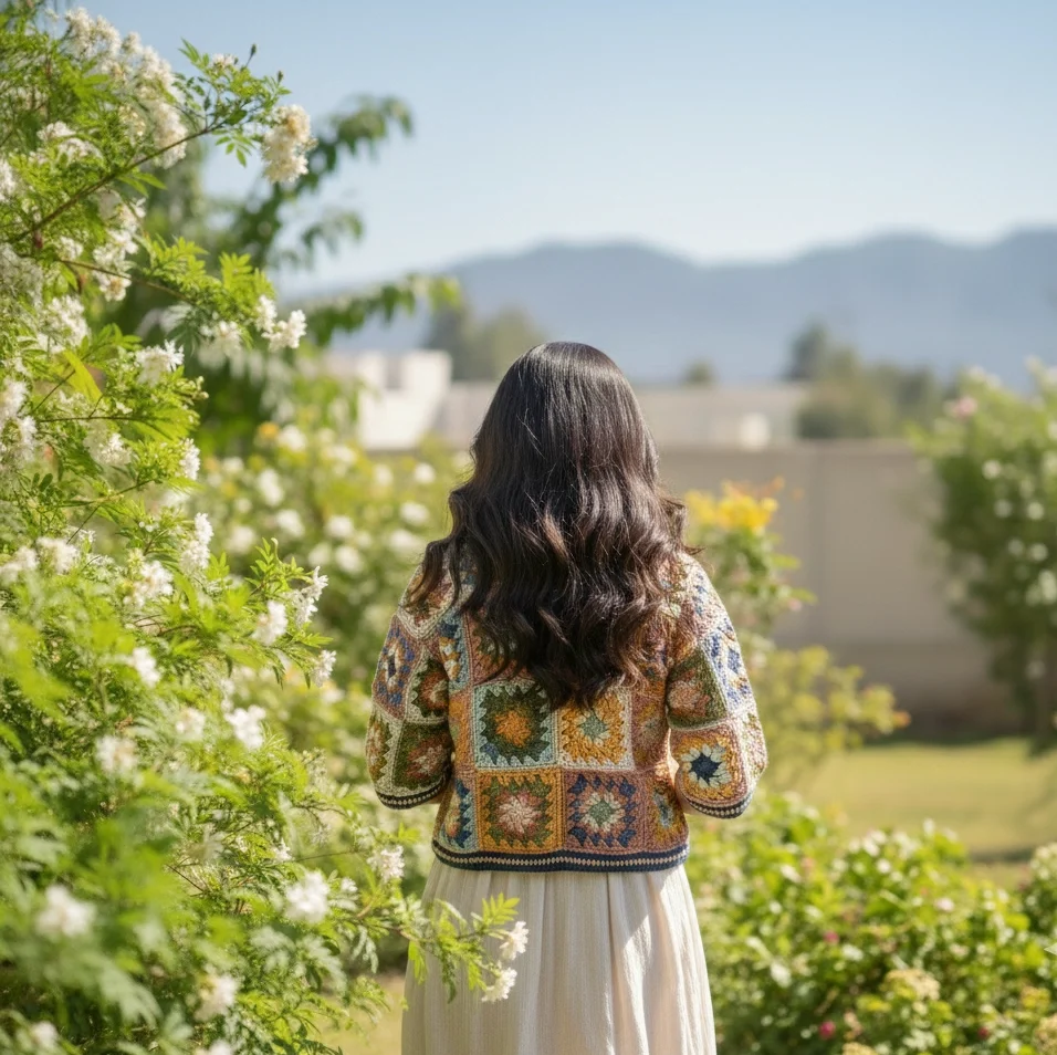 The Meadow Bloom is the perfect “transitional” piece. For early Autumn, wear it as-is with linen trousers. When the temperature drops, layer it over a crisp white collared shirt to let the vibrant navy borders and earth-toned squares truly pop.