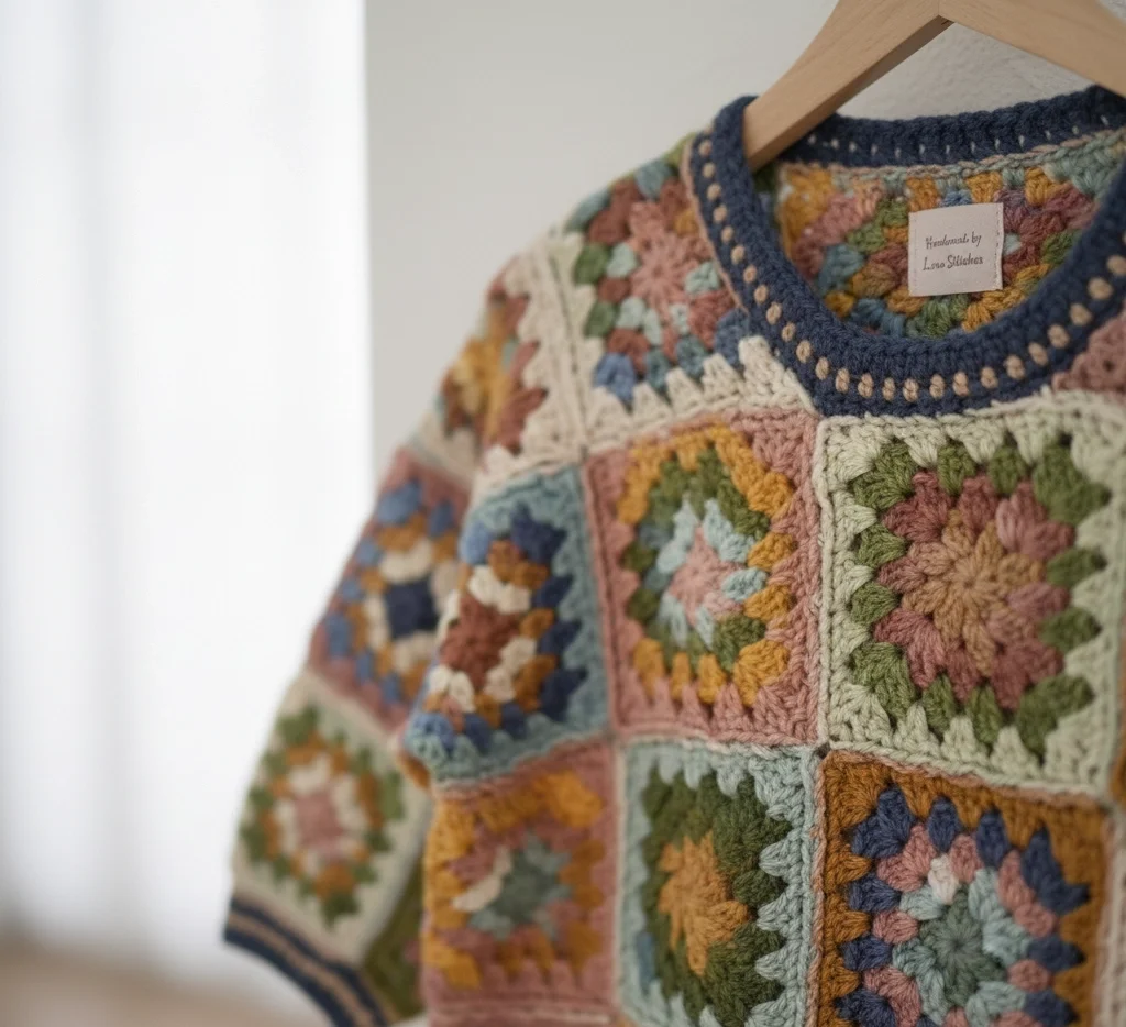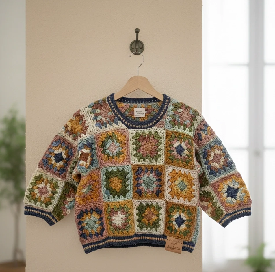 Bring a touch of vintage nostalgia to your modern wardrobe with this 100% handcrafted granny square pullover. Featuring a beautiful mosaic of earthy moss, golden yellow, and dusty rose tones, each top is a one-of-a-kind masterpiece joined by a striking navy border. Made from a premium, breathable cotton blend, its relaxed, slightly cropped fit and ribbed balloon sleeves make it the perfect transitional piece for any season.
