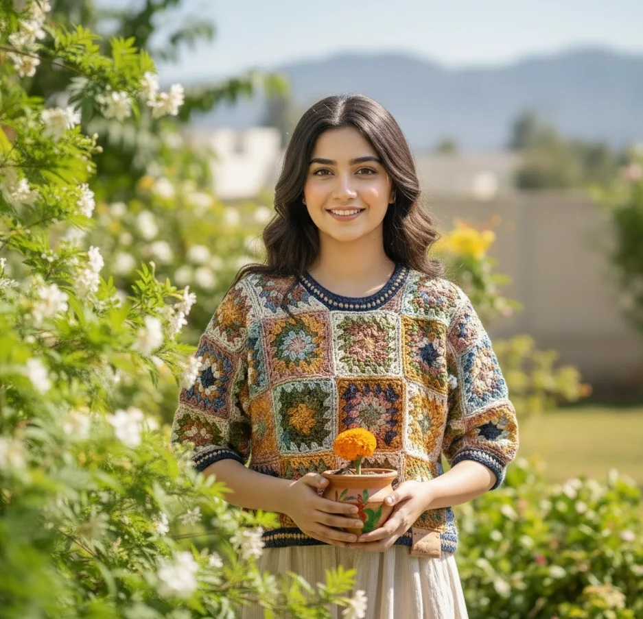 Slow Fashion: Each Meadow Bloom Pullover is “Handmade with Love.” Please allow 14–21 business days for our artisans to crochet and assemble your piece.