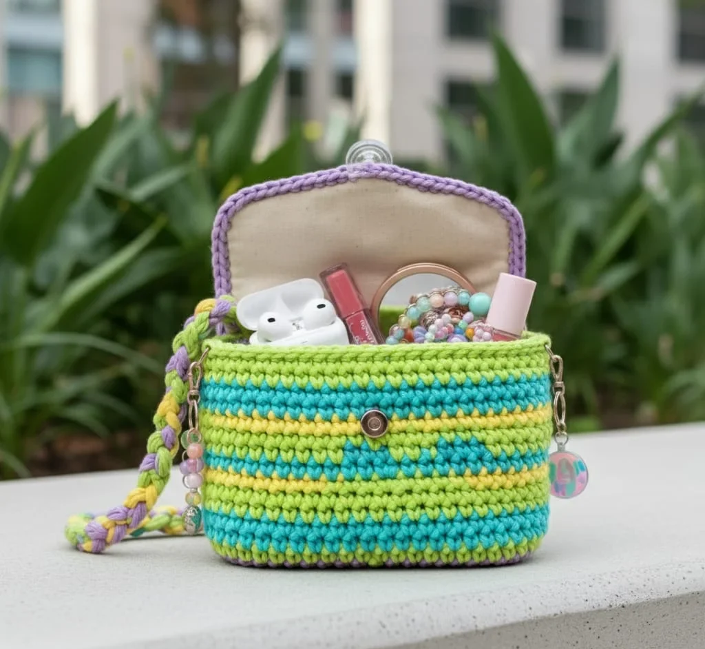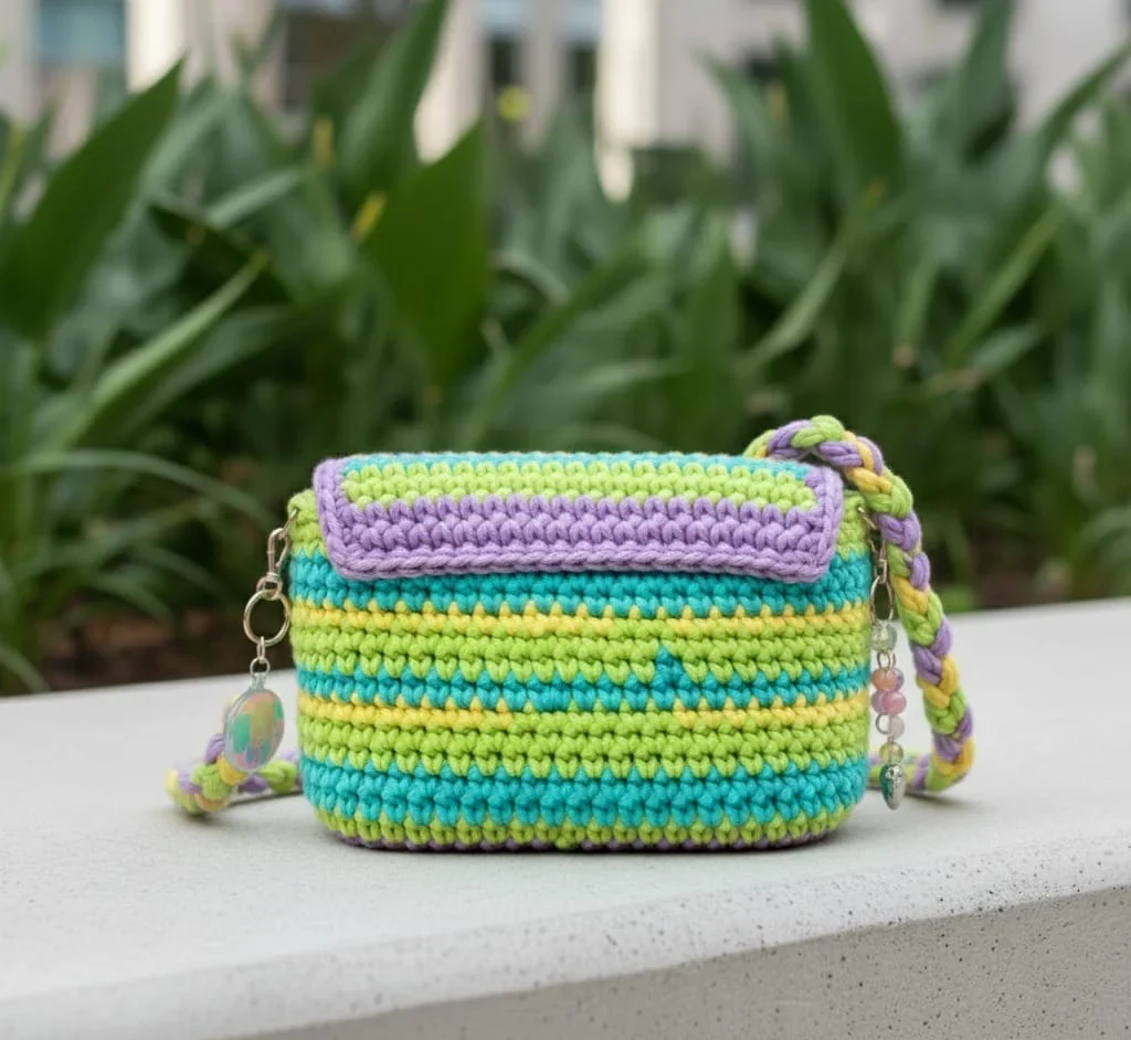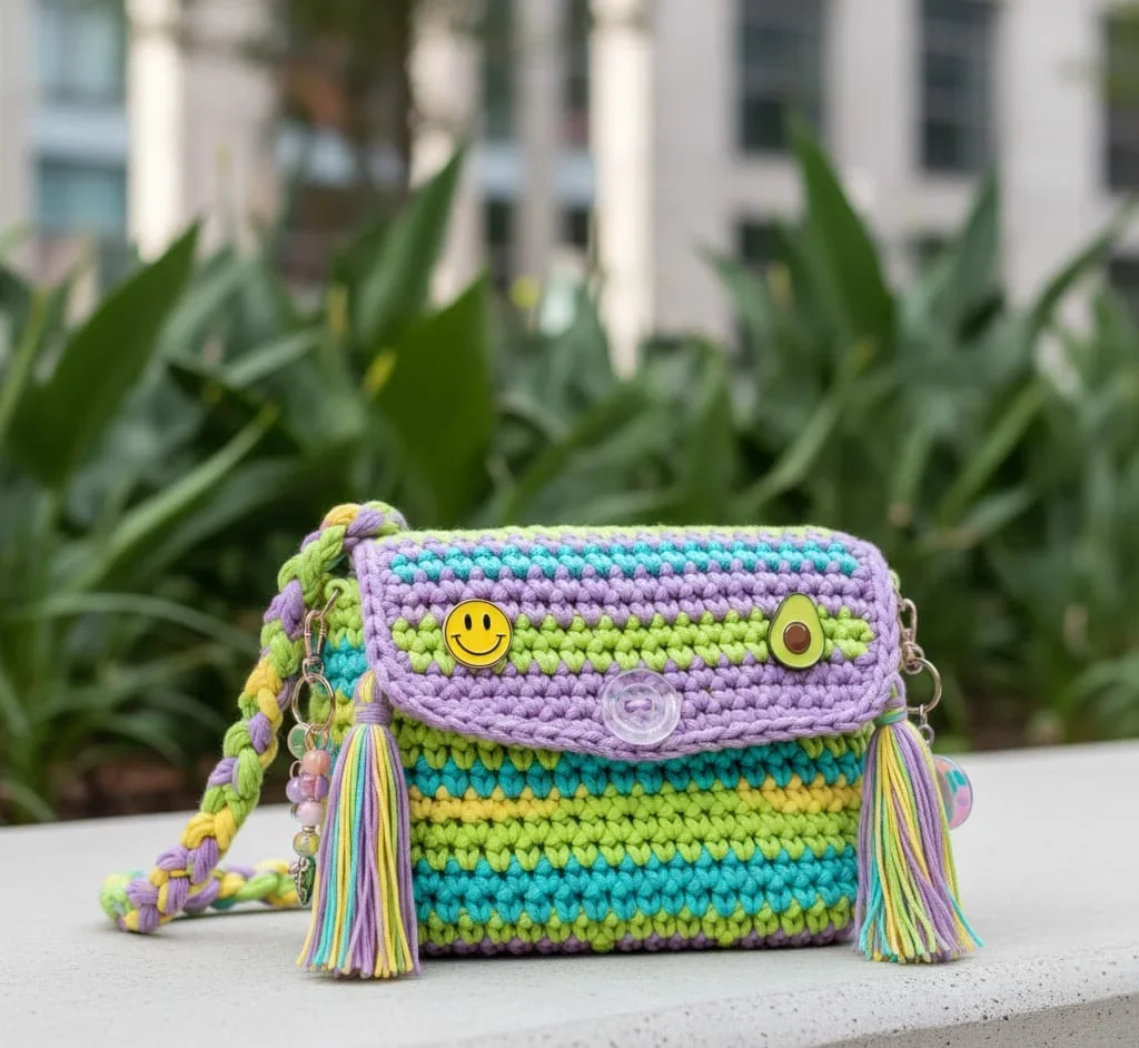 The Neon Dream Satchel is a playful, hand-crocheted crossbody bag defined by vibrant horizontal stripes of lime green, turquoise, and lavender. This bag captures the modern, expressive aesthetic with its fun enamel patches, colorful beaded chain, and plush yarn tassels, making it a perfect statement piece for playful, everyday style.