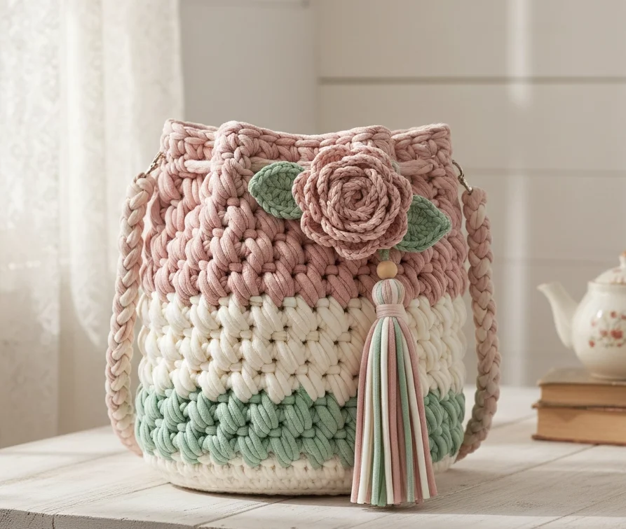 The Rosewater Bloom Bucket Bag is designed to capture a sweet, romantic aesthetic, successfully blending soft, thick textures with delicate, feminine details. The bag is constructed using a chunky yarn, which ensures pronounced texture and excellent structure. Its design features bold horizontal color blocking across three soft pastel shades. This piece elevates the simple bucket shape into a charming, unique statement, making it perfect for a spring or summer wardrobe.