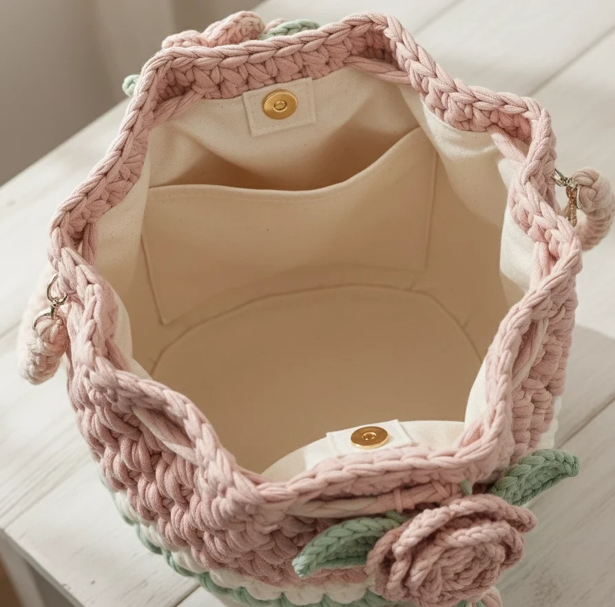 Rose Appliqué: The defining focal point of the design is a meticulously crocheted, three-dimensional rose and leaf set. This appliqué is fixed near the drawstring closure.