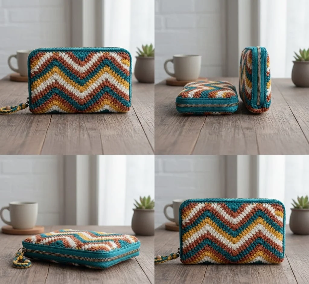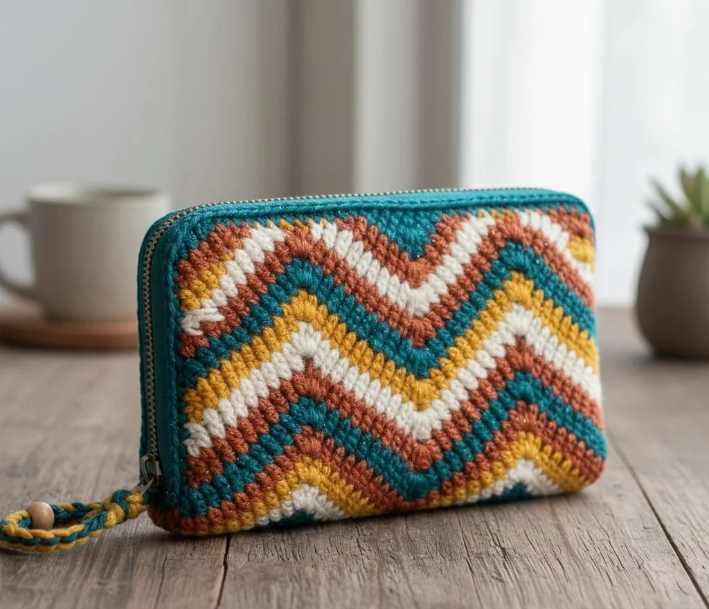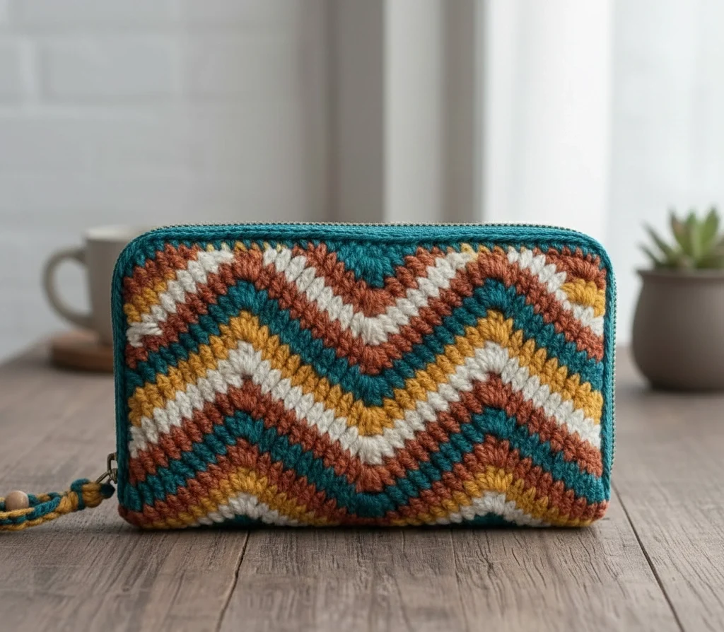 The Zigzag Zest Zip Wallet is a vibrant, hand-crocheted zip-around wallet featuring a dynamic chevron pattern in a lively blend of teal, mustard yellow, burnt orange, and cream. Designed for excellent organization, it includes a secure zipper, a sturdy cotton canvas lining, and multiple interior slots, making it a functional and playful statement piece for daily use.