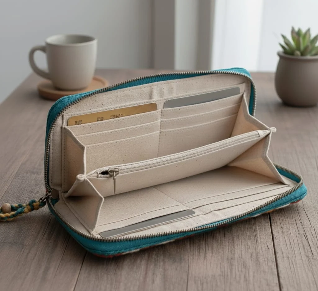 The wallet features a high-quality, smooth-gliding zipper in a complementary teal color that wraps around three sides, providing full security for your valuables. The interior is expertly lined with a durable, neutral-toned cotton canvas, offering comprehensive storage: